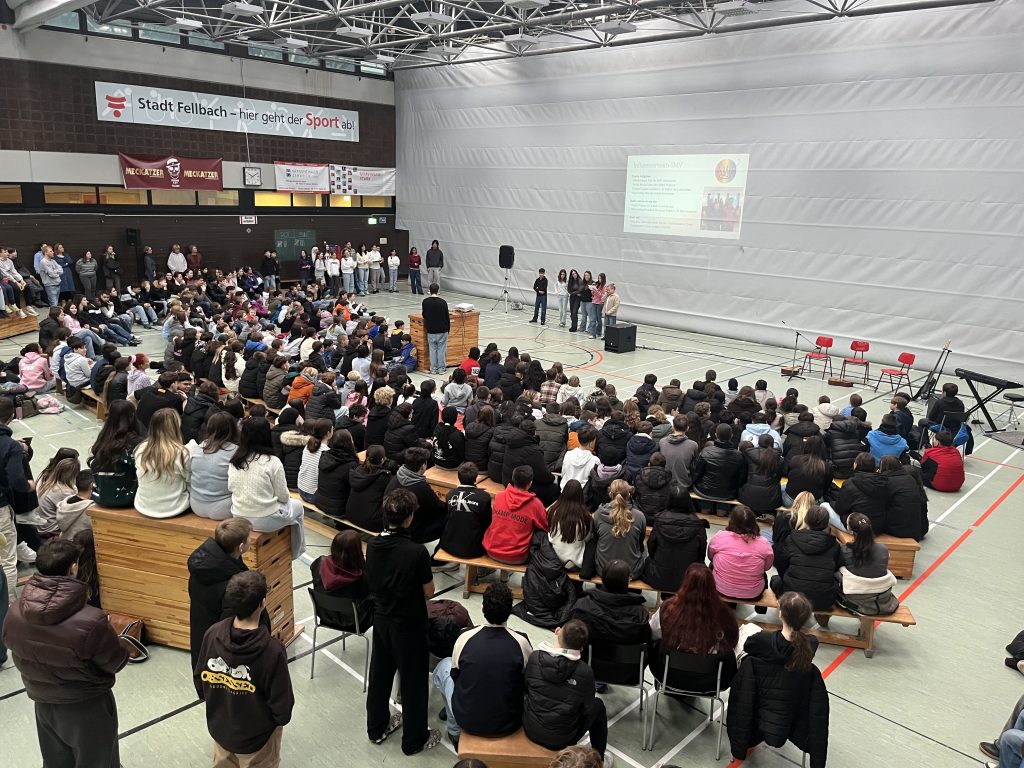 Am Donnerstag, den 11. Dezember, fand in der Sporthalle unsere halbjährliche Schülerversammlung der Sekundarstufe 1 statt. Eröffnet wurde das Treffen stimmungsvoll durch einen Auftritt der Schulband, die sofort für gute Atmosphäre sorgte.