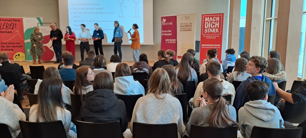 In der Mittagsphase kamen hochkarätige Dialogpartnerinnen und Dialogpartner aus Politik, Wirtschaft und Zivilgesellschaft hinzu, um sich in einem Gallery Walk direkt mit den Jugendlichen auszutauschen. So erhielten die Schülerinnen und Schüler die besondere Gelegenheit, ihre Sichtweisen und Wünsche an Entscheidungsträgerinnen und Entscheidungsträger weiterzugeben – und gleichzeitig zu erleben, dass ihre Perspektiven ernst genommen werden.